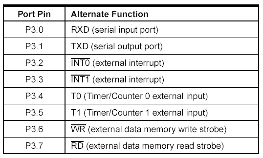 - AD0~AD7(P0.0~P0.7): multiplexed low-byte address bus and data bus for external addressing